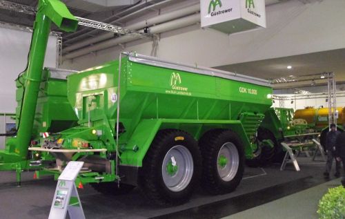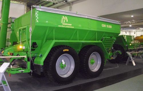A Güstrower cég kiállÃtotta az új fejlesztésű 10.000 literes tandem műtrágyaszóró gépét, amely különbözÅ‘ szórótárcsákkal szerelhetÅ‘, alap és fejműtrágyázáshoz, valamit meszezéshez illetve egyéb szárazanyag (tyúktrágya, komposzt) kijuttatásához is alkalmas.