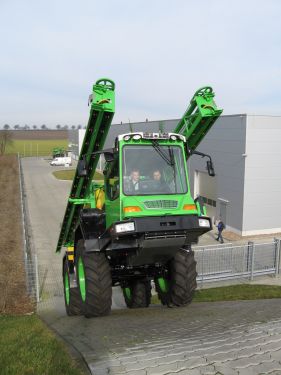 A jármű egy nagyteljesÃtményű, mechanikus hajtóművel rendelkezik, ami nehéz talajviszonyok esetén is hatékony, különlegesen magas, állandó vonóteljesÃtményt biztosÃt. A kapcsolható összkerékhajtás mindkét tengelyen differenciálzárral kompromisszum nélkül 100%-os nyomatékátadást tesz lehetÅ‘vé. A tengelyek azonos fordulattal, teljesen azonos nyomatékkal hajtottak, ez a hatás abszolút nyugodt járást és talajkÃmélÅ‘ haladást biztosÃt a kultúrában. A megemelt tengelyelrendezés a gépnek kiemelkedÅ‘ szabad hasmagasságot biztosÃt. A járószerkezet minden tengelyen teljesen rugózott, ez a járműnek optimális menettulajdonságokat kölcsönöz. A beépÃtett pótkocsiféken és kapcsolószerkezeten keresztül vontatmány hozzákapcsolása is lehetséges. Széria felszereléshez tartozik a sárvédÅ‘ és a gumitoldat. Ezek védik a rászerelt munkagépet és a mögötte haladó járművet a sár felszóródásától.